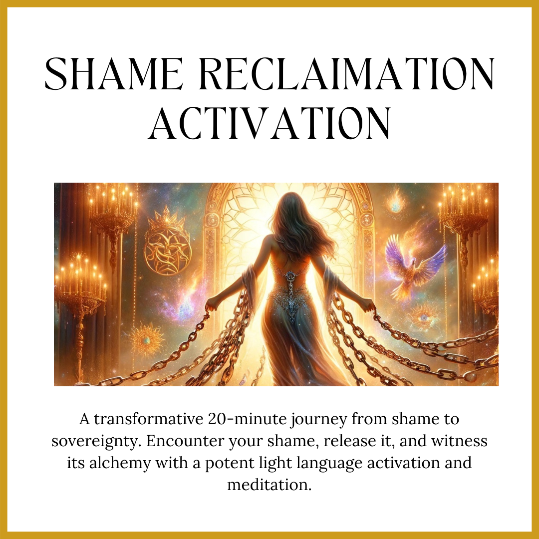 Dive into the "Shame Reclamation Activation," a transformative 20-minute journey from shame to sovereignty. Encounter your shame, release it, and witness its alchemy with a potent light language activation and meditation. Complete with insightful journal prompts, this experience is your first step towards inner liberation and crafting alchemy within.