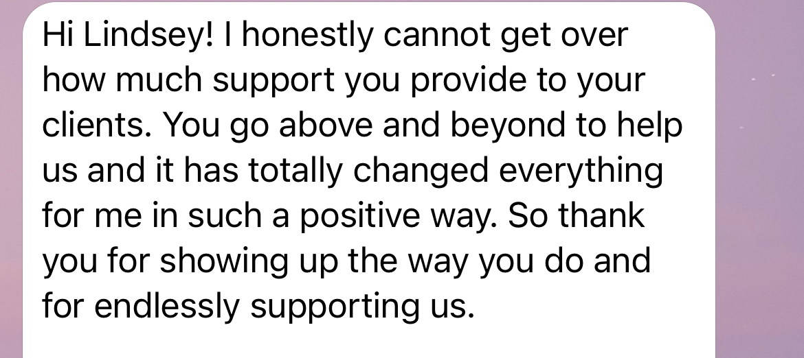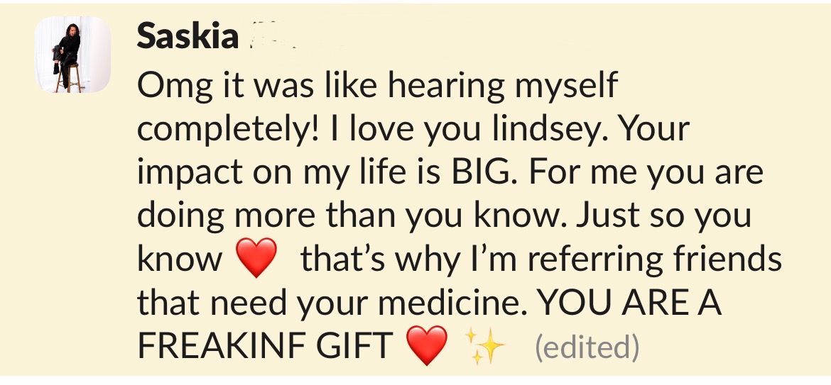 Experience Lindsey's Guiding Light: Dive into an exclusive Slack community, where I, Lindsey, will be your constant guide. Here, you'll find support, answers to your questions, and a series of activations and insights. This is a space for growth, learning, and profound transformation.